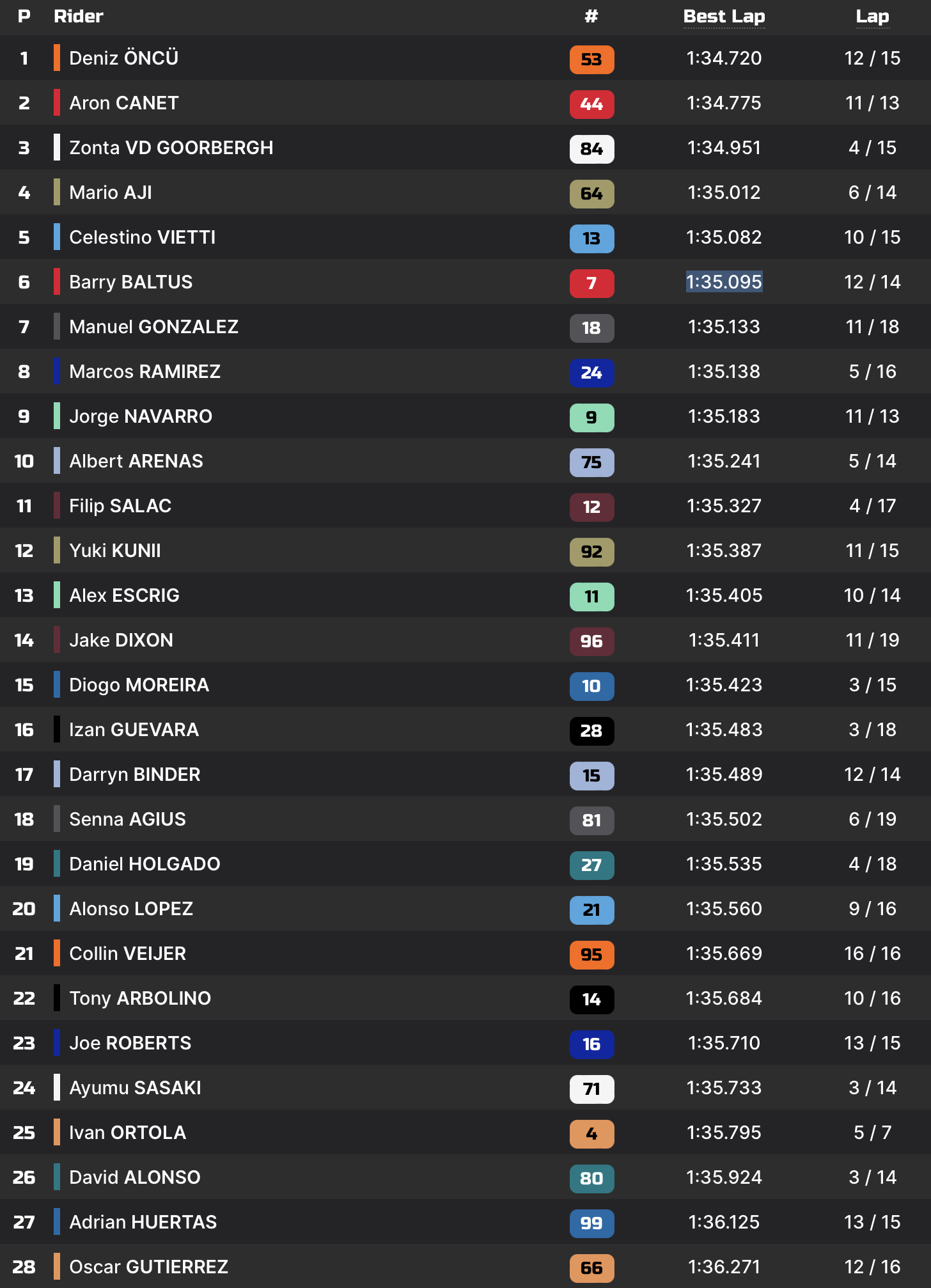 De nombreux pilotes progressent, et ne cessent d’améliorer leur meilleure marque personnelle, mais personne n’est en mesure de déloger Aron Canet de la position de leader avant les dernières minutes de la séance. Lorsque les choses s’accélèrent, l’Espagnol améliore lui-même la marque de référence de deux dixièmes. À trois minutes de la fin, c’est Deniz Oncu qui prend le meilleur sur le n°44, avec un chrono en 1:34.720.