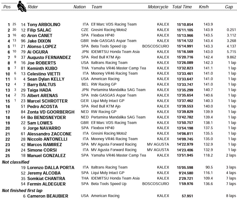 Tony Arbolino : « Un résultat incroyable ! C’était une vraie victoire. Si la course n’avait pas été arrêtée, je pense toujours que j’aurais gagné. J’étais vraiment concentré et calme et j’ai senti que la victoire était à moi. J’étais sûr à 100 % que nous avions fait du bon travail tout au long du weekend pour obtenir ce résultat. Nous sommes heureux des points que nous avons marqués. Mais la victoire est pour nous, pour l’équipe. C’est ma première victoire sur le mouillé et j’en suis très heureux. Continuons sur cette lancée parce que nous montrons un très bon niveau. Nous devons en profiter et continuer à nous amuser. »