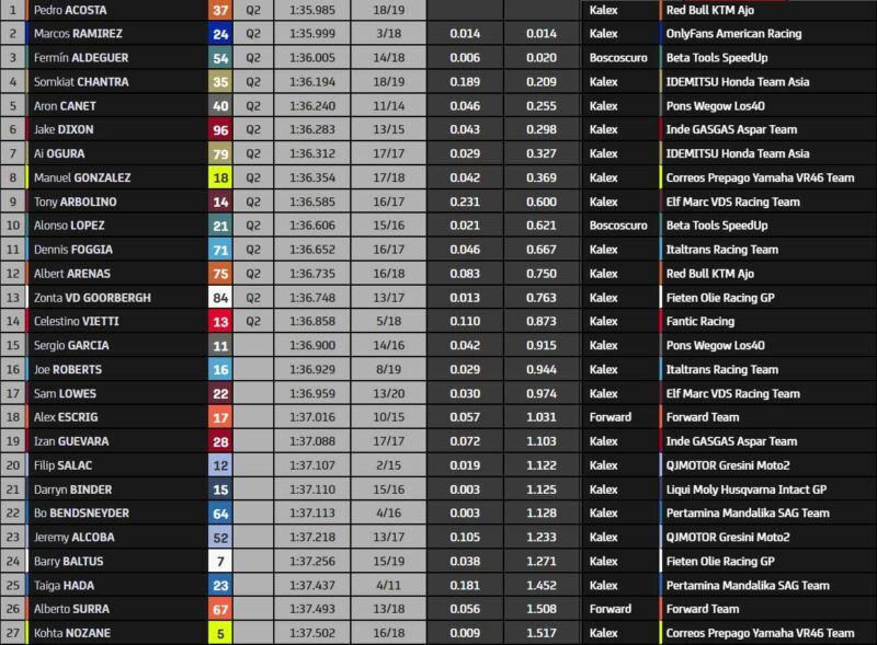 La séance est extrêmement calme, l’une des plus tranquilles de l’année. Mais dans les cinq dernières minutes, tout peut s’enflammer. D’ailleurs, Aron Canet se retrouve par terre en essayant de pousser. Une chute sans gravité. Pedro Acosta réalise brièvement le meilleur temps, mais son temps n’est pas validé. Il retente sa chance dans le tour suivant, et cette fois, ça passe. Il n’a que 14 millièmes d’avance, mais ça suffit pour passer premier.