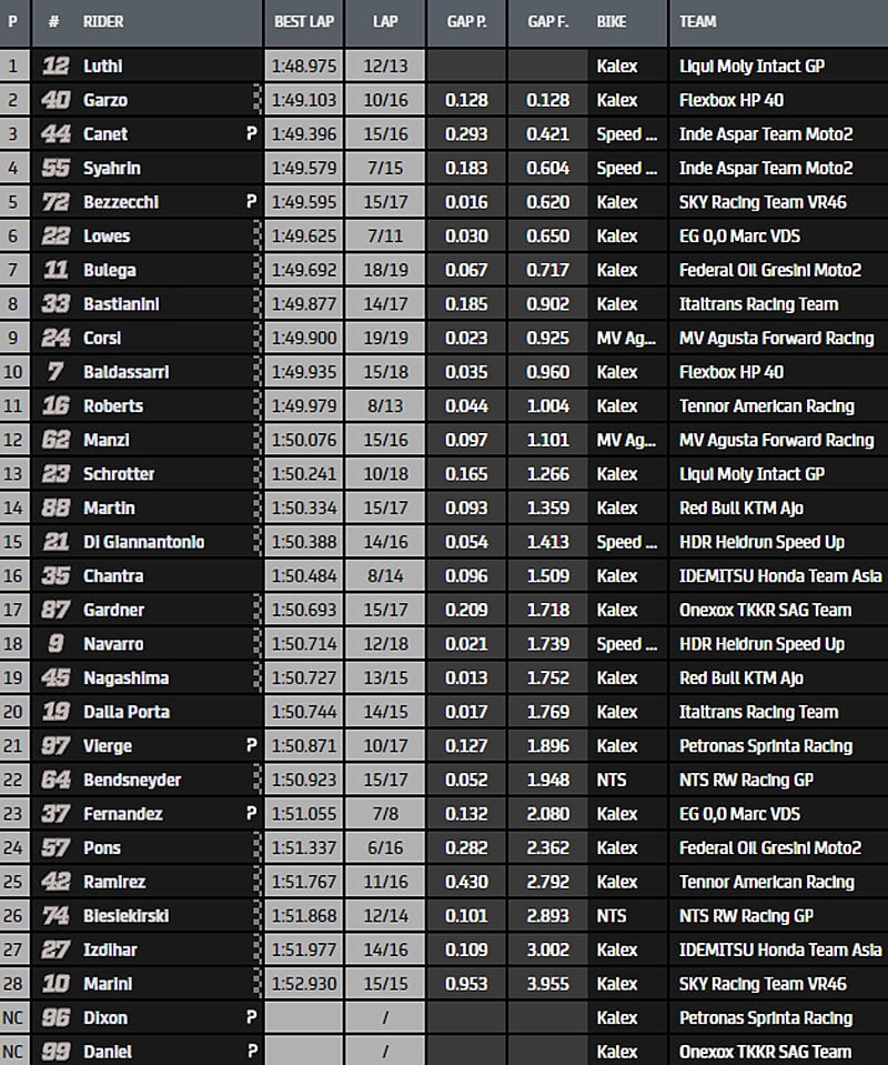 À la mi-séance, Héctor Garzó (Kalex, Flex – Box Pons HP 40) crée la surprise avec un 1’49.103. Le jeune Espagnol progresse régulièrement cette année et commence à bien se faire remarquer…