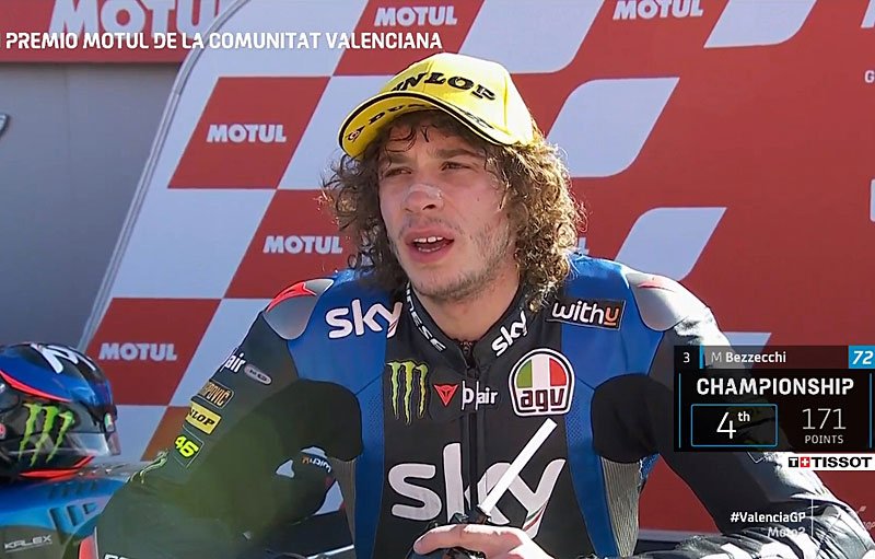 Marco Bezzecchi (3e) : « Malheureusement j’ai été passé par deux pilotes dans le dernier tour. Je n’étais pas super bien pendant la course, je m’attendais à mieux. Il faisait plus chaud mais aujourd’hui le problème c’était le vent. Je me suis dit « ok je vais essayer de rester devant, garder mon rythme et voir ce qui se passe » mais je savais qu’en fin de course quelqu’un pouvait arriver et passer. J’étais trop à la limite pour résister et ça aurait été dommage de tomber. Troisième place, je ne suis pas complètement content mais un podium c’est toujours important. »