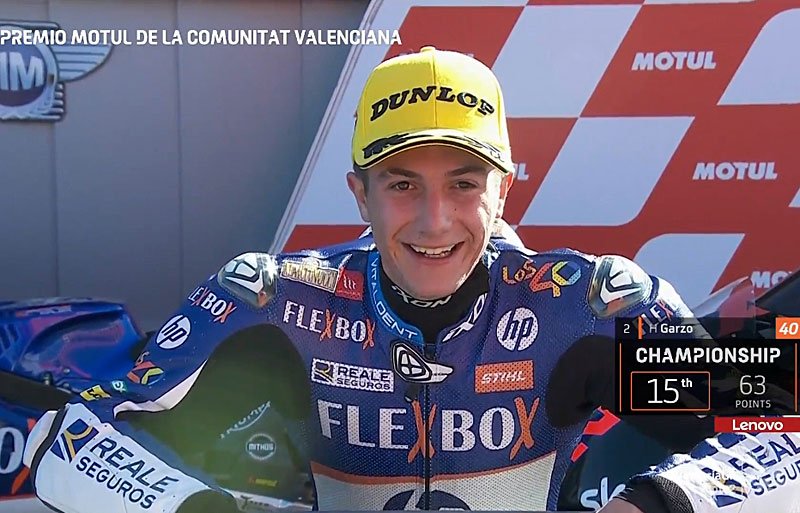 Héctor Garzó (2e) : « Je suis très très content, un podium chez moi ! Aujourd’hui la course était très difficile. Quand je suis arrivé sur ma place en grille j’ai senti le vent et je me suis dit que ça allait être dur mais j’ai pu trouver mon rythme. J’ai perdu un peu de temps en me bagarrant avec Schrötter au début. Je ne voulais pas passer Jorge [Martín] trop tôt car je savais qu’il avait un bon rythme mais ensuite il m’a repassé à cinq ou six tours de la fin et j’ai vu son rythme. Même si Di Giannantonio a chuté on était quand même dans le premier groupe, la victoire était très proche. Je suis content de cette deuxième place, merci à mon équipe, à Sito [Pons], à ma famille et à mes fans. »