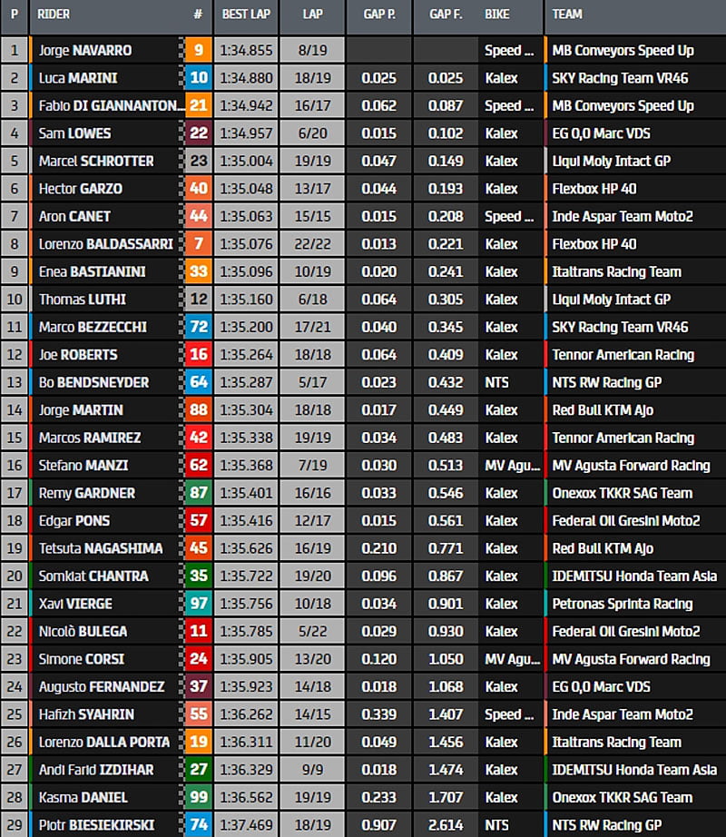 Fin de séance et c’est Navarro qui a tenu bon en 1.34.855s devant Marini, Di Giannantonio, Lowes et Garzo. Canet, Baldassari, Bastianini et Luthi ferment la marche du top10.