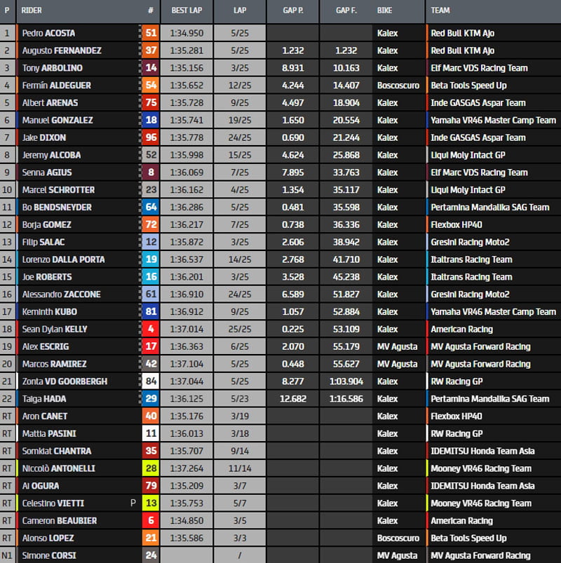 Les deux hommes, séparés par 7/10, contrôlent donc la course devant Tony Arbolino, Arón Canet, Fermín Aldeguer, Albert Arenas race, Manuel Gonzáles, le vétéran Mattia Pasini qui fait une belle course, et Jake Dixon.