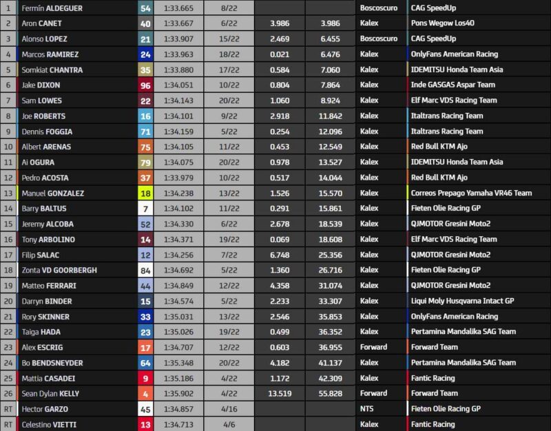 Aldeguer prend la troisième place du championnat, alors que Pedro Acosta était en perdition. Sam Lowes quitte le mondial depuis la septième place, et s’en va vers d’autres horizons, toujours avec MarcVDS.