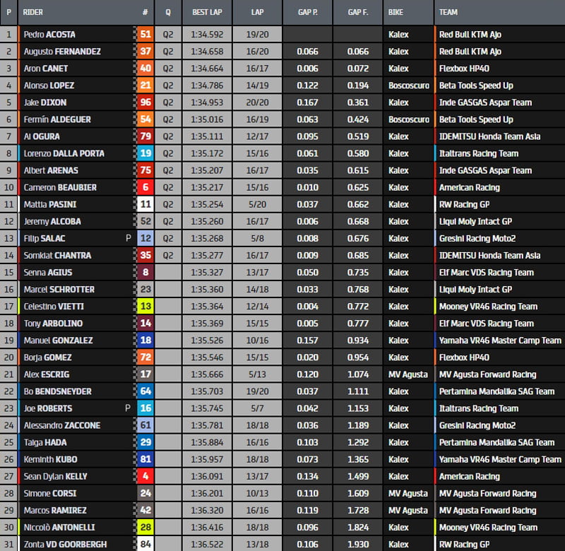 Meilleur temps au finish pour Acosta en 1.34.592s. Il devance Fernandez, Canet, Lopez, Dixon, Aldeguer, Ogura, Dalla Porta, Arenas, Beaubier, Pasini, Alcoba, Salac et Chantra. L’ensemble de ces pilotes rejoint ainsi la Q2