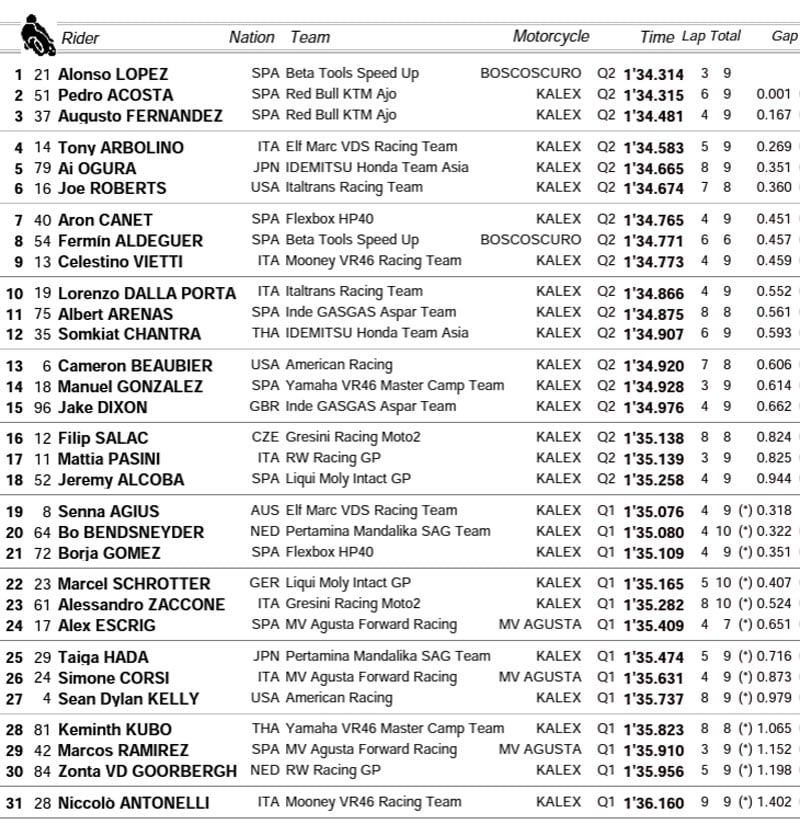 Quatrième temps pour Alonso Lopez (Speed Up), qui a précédé Jake Dixon (Aspar), son coéquipier Fermin Aldeguer et le Japonais Ai Ogura qui joue le championnat face à Augusto Fernandez. Ogura devance le meilleur des pilotes italiens, Lorenzo Dalla Porta qui précède Albert Arenas (Aspar) et Cameron Beaubier (American Racing). Mattia Pasini s’est également qualifié directement pour la Q2, au contraire notamment de Celestino Vietti (Mooney VR46 Racing Team) et Tony Arbolino (Marc VDS), condamnés à la Q1.