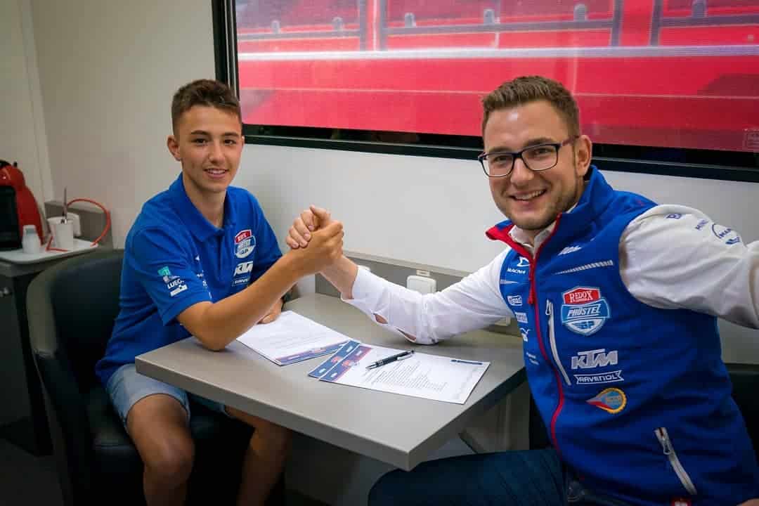 Florian Prüstel : « Nous avons signé le contrat avec Jason Dupasquier ce matin avant la course Moto3 ici à Misano. Je suis heureux d’accueillir un Suisse et donc le premier coureur germanophone dans l’équipe. Même si son allemand n’est pas encore optimal, je suis heureux de l’avoir dans notre équipe. Nous surveillons Jason depuis un certain temps, nous l’avons fait tester pour nous en Autriche et les négociations sont maintenant terminées. Avec lui, nous incorporons un rookie et, pour nos sponsors comme pour nous, la proximité de la Suisse est très importante. Nous nous réjouissons de la coopération et espérons qu’il terminera la Rookies Cup avec succès et qu’il obtiendra d’autres points en CEV, afin qu’il puisse commencer avec nous avec de bonnes sensations. »