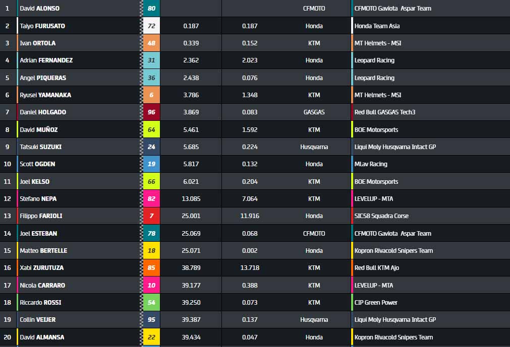 David Alonso remporte une victoire énorme, intelligente, devant un méritant Taiyo Furusato et un exceptionnel Ivan Ortola, revenu de nulle part. Adrian Fernandez et Angel Piqueras complètent le top 5, alors que Daniel Holgado, septième, continue de perdre du terrain.