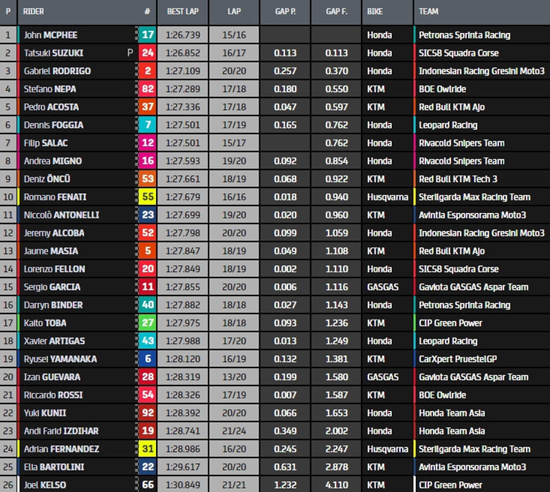 Mais sous le drapeau à damier, McPhee rafle la mise en 1’26.739 devant Suzuki, Rodrigo, Nepa et Acosta. Foggia mène le reste de la meute. Lorenzo Fellon est 14e et donc virtuellement en Q2…