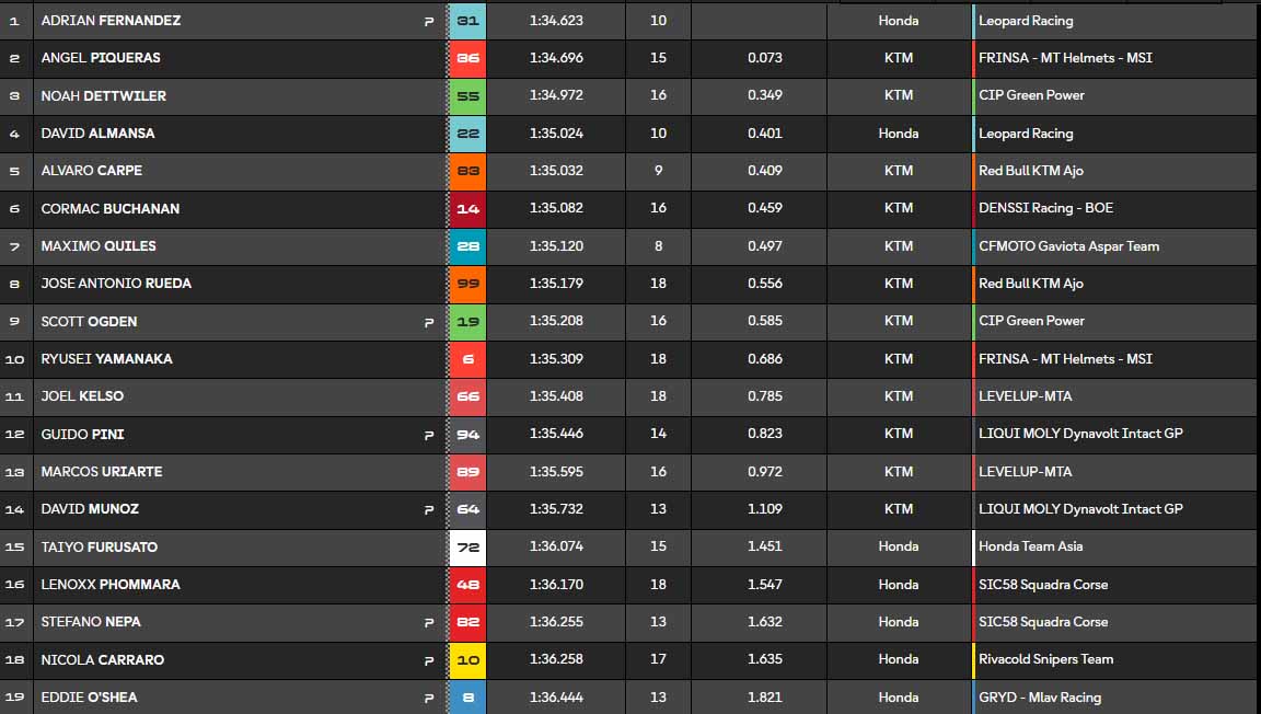 Rueda aussi est rapide, tout comme Carpe et Cormac Buchanan (KTM Denssi Racing Boé). Plusieurs pilotes différents passent en tête, car ils sont de plus en plus rapides à mesure que les minutes s’égrènent. Actuellement, c’est au tour d’Angel Piqueras (KTM MT Helmets MSi) d’occuper la première place.