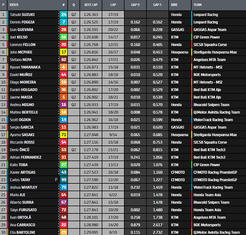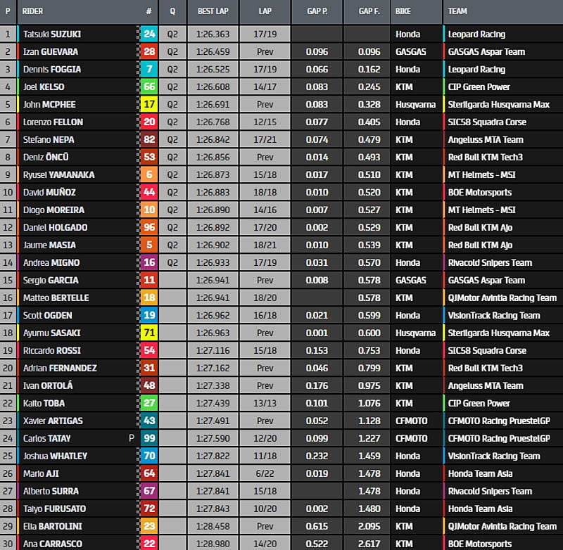 En deuxième position le pilote du team Husqvarna Sterilgarda Max, John McPhee qui a précédé Dennis Foggia (Leopard Racing). Quatrième Deniz Oncu (Red Bull KTM Tech3) devant Ayumu Sasaki (Husqvarna) et la KTM de Ryusel Yamanaka (MT Helmets -MSI). Huitième temps pour Tatsuki Suzuki (Leopard Racing), avec Adrian Fernandez (Red Bull KTM Tech 3) et Riccardo Rossi (Sic58 Squadra Corse) pour clôturer le TOP 10 des temps.