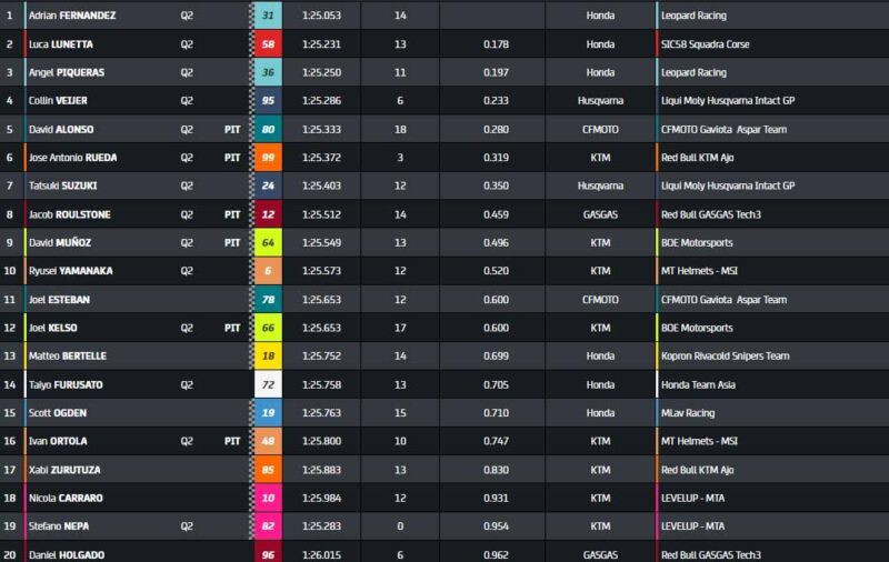 Finalement, Adrian Fernandez termine en tête exactement comme lors de la FP. Il est suivi par Luca Lunetta et Angel Piqueras, soit un top 3 100% Honda ! Collin Veijer est quatrième, David Alonso cinquième et Daniel Holgado, 20e !