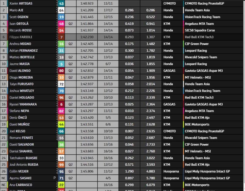 Mario Aji est deuxième, tandis que Scott Ogden est relégué à la troisième position. Le Britannique, comme Romano Fenati (Honda Snipers Team), devra passer par la Q1 pour essayer de rejoindre les meilleures positions.