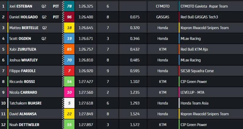 Finalement, Joel Esteban réalise le meilleur temps même si ça ne sert à rien. Daniel Holgado est deuxième, donc qualifié, juste devant Matteo Bertelle (Honda Snipers Team) et Scott Ogden, qui participeront tous à la Q2. Le premier lésé n’est autre que le rookie Xabi Zurutuza (Red Bull KTM Ajo), qui revient de blessure.