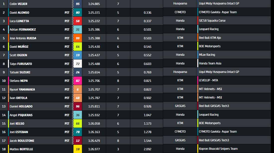 Finalement, Collin Veijer s’impose dans cette séance avec trois dixièmes d’avance sur David Alonso ; le premier tour en 1’24 de l’histoire en Moto3 sur ces terres. Le rookie Luca Lunetta complète la première ligne, juste devant Adrian Fernandez et José Antonio Rueda. Quel final !