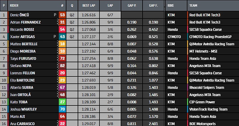 A l’issue de cette Q1 tumultueuse, Deniz Öncü (KTM, Red Bull KTM Tech3, #53) est déjà rentré dans les stands mais se qualifie en Q2, avec le meilleur chrono de cette Q1.Adrian Fernández (KTM, Red Bull KTM Tech3, #31) est second, et les 2 derniers qualifiés ont chuté : Riccardo Rossi (Honda, SIC58 Squadra Corse, #54) et Xavier Artigas (CFMoto, CFMoto Racing PruestelGP, #43). Lorenzo Fellon (Honda, SIC58 Squadra Corse, #20) termine à la 9e position de cette Q1, quant à Kaito Toba (KTM, CIP-Green Power, #27), il chute dans son dernier tour.