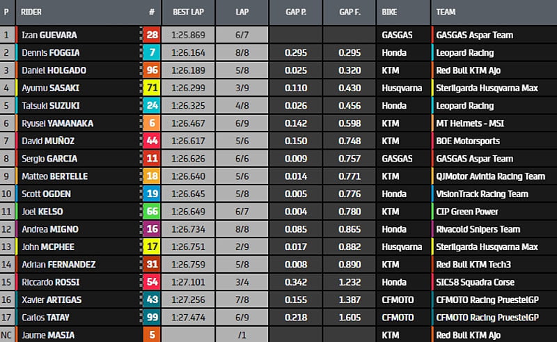 Mais c’était sans compter sur Izan Guevara (GasGas, GasGas Aspar Team, #28), qui réalisé le meilleur chrono, 1’25.869, en 1 seul tour lancé. Le pilote Espagnol partira en pole position, devant Dennis Foggia (Honda, Leopard Racing, #7) relégué à 0.295s, et Daniel Holgado (KTM, Red Bull KTM Ajo, #96), à 0.320 s.