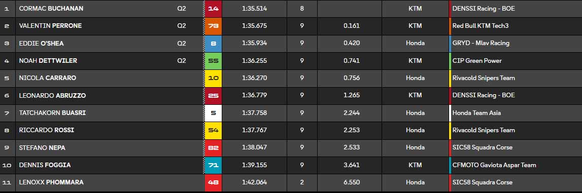 Rapidement, Cormac Buchanan (KTM Denssi Boé) se démarque assez largement. Mais Perrone répond efficacement. Finalement, au bout du compte, Cormac Buchanan se qualifie en premier, devant Perrone, Eddie O’Shea (Honda GRYD MLav Racing) et Noah Dettwiler (KTM CIP Green Power).