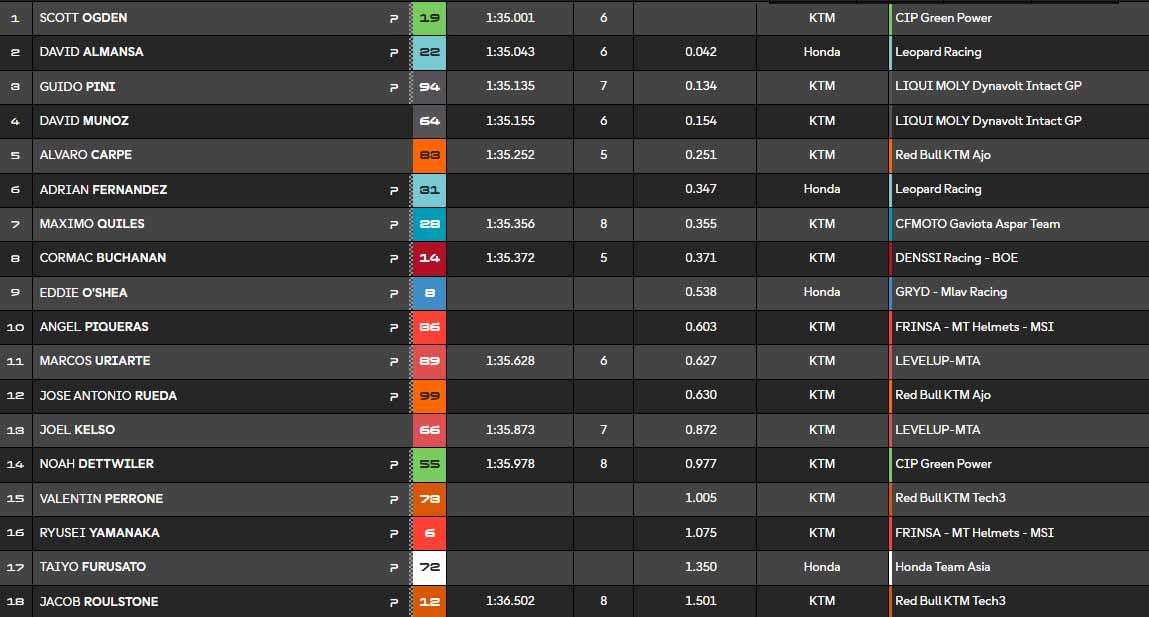 Scott Ogden ! Personne ne peut contrer le Britannique en raison des drapeaux jaunes, il décroche sa première pole position en Moto3 ! Il sera rejoint par David Almansa (Honda Leopard Racing) et Guido Pini sur la première ligne, alors que José Antonio Rueda devra composer avec la 12e place. C’est la première pole d’un anglais en Moto3 depuis John McPhee en 2020. Quel exploit !