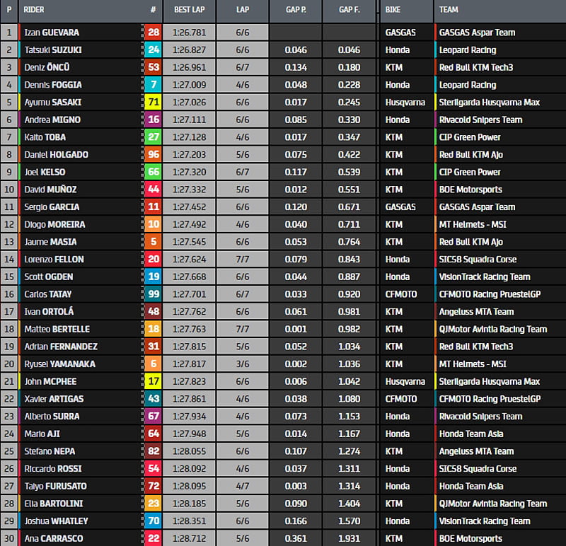 Le classement évolue à chaque tour, 20 pilotes sont désormais dans la même seconde. Aussi, à la fin de cette séance de Warm Up, Izan Guevara (GasGas, GasGas Aspar Team, #28) termine en tête, en 1’26.781, devant Tatsuki Suzuki (Honda, Leopard Racing, #24) et Deniz Öncü (KTM, Red Bull KTM Tech3, #53).