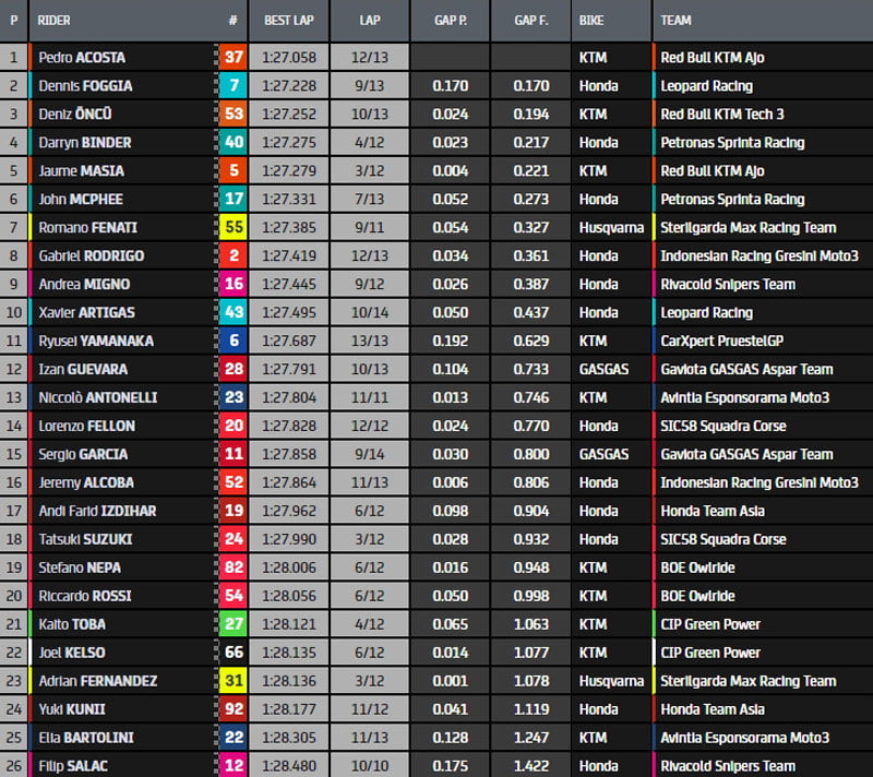 Alors que le drapeau à damiers sera présenté dans moins de 3 minutes, Dennis Foggia (Honda, Leopard Racing, #7) prend les commandes en 1’27.228, devant Deniz Öncü (KTM, Red Bull KTM Tech3, #53) et Darryn Binder (KTM, Petronas Sprinta Racing, #40). Ce dernier s’entraine d’ailleurs au « Ride Through », sans doute pour que son équipe estime le temps qu’il va perdre en course.