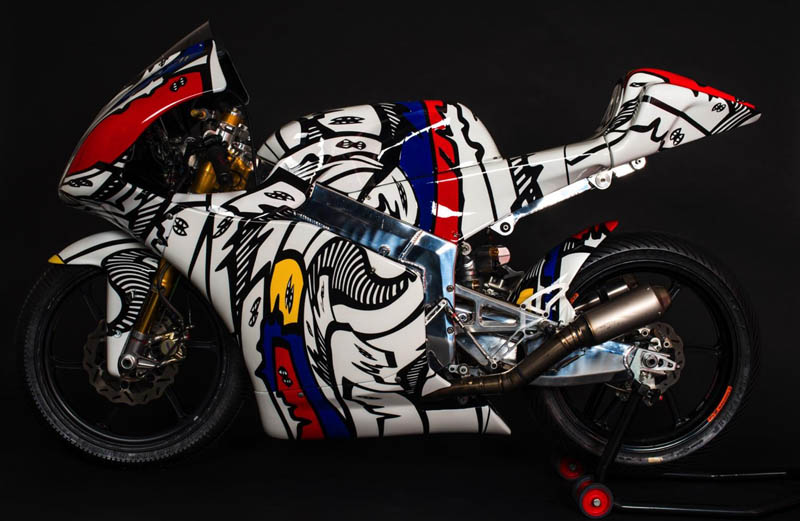 La photo d’illustration présente une version décorée de la Moto3 250 GP « EVO » Kymco Oral décorée par l’artiste allemand Walter Maurer et les deux vidéos ci-dessous vous permettront d’en savoir beaucoup plus sur cette Moto3 Italo-Taïwanaise.