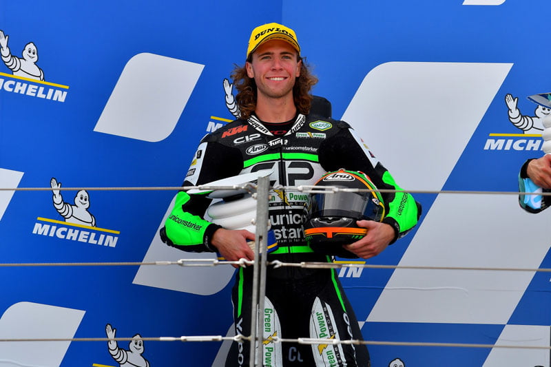 Darryn Binder (2e) : « Ce fut un bon week-end. Il a débuté en force avec le meilleur temps de la FP1. Je suis parvenu à réaliser de bonnes qualifications. Je suis parti en 11e position et j’ai fait une très bonne course. Quand le groupe s’est cassé, j’ai réussi à combler l’écart et à revenir aux avant-postes. J’étais en bagarre pour la victoire à l’arrivée. Malheureusement, je n’étais pas assez proche dans le dernier virage pour porter une attaque. Je suis très heureux de cette deuxième place. Je suis content de rester en Aragon pour tenter de gagner la semaine prochaine. »