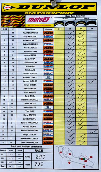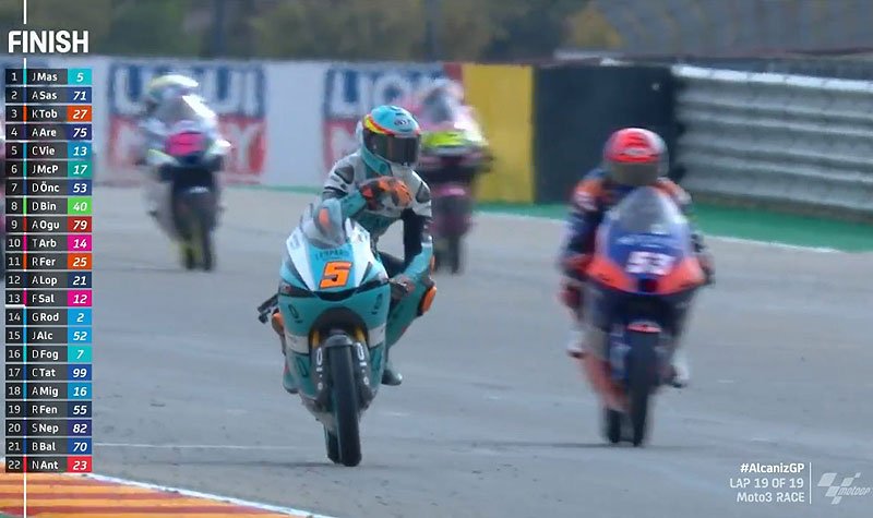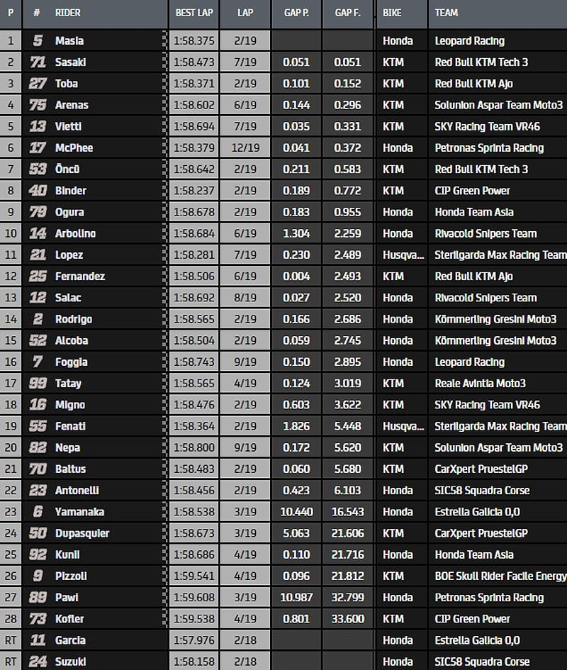 Comme d’habitude, Jaume Masiá bénéficie de la vitesse de sa Honda et procure la 800e victoire en Grands Prix à la marque japonaise en s’imposant devant le pilote Red Bull KTM Tech3 Ayumu Sasaki qui obtient son premier podium en Grand Prix.