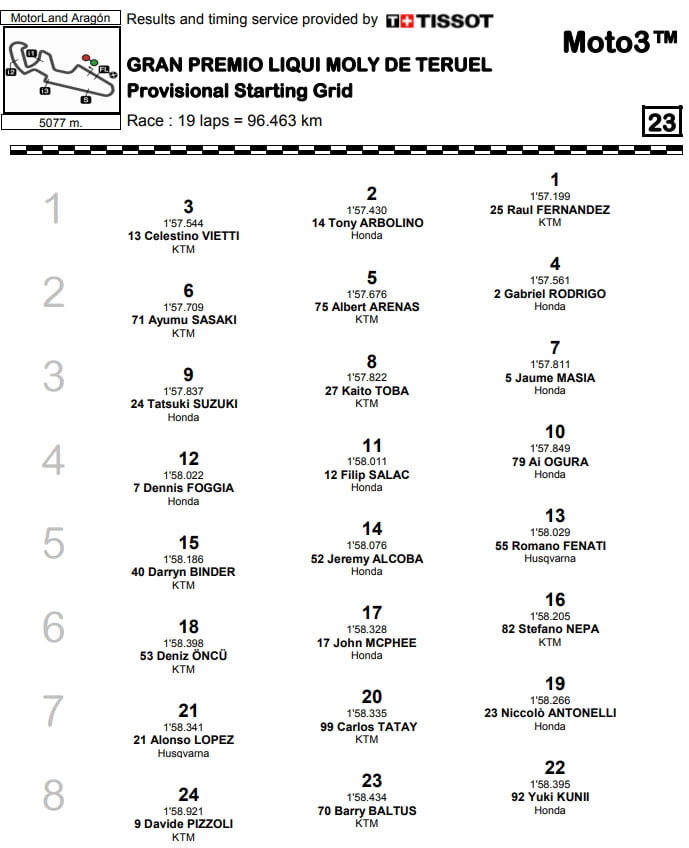 Gabriel Rodrigo (Honda, Kömmerling Gresini Moto3), sauvé à l’issue des rattrapages, emmènera pour sa part la deuxième ligne. L’Argentin y sera accompagné du leader au Championnat Albert Arenas (KTM, Solunion Aspar Team Moto3) et de Ayumu Sasaki (KTM, Red Bull KTM Tech3) qui réalise sa meilleure qualification de la saison.