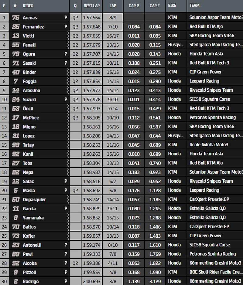 Les 14 pilotes qualifiés pour la Q2 sont: Arenas, Fernandez, Vietti, Fenati, Ogura, Sasaki, Binder, Foggia, Arbolino, Suzuki, Oncu, McPhee Masia et Alcoba.