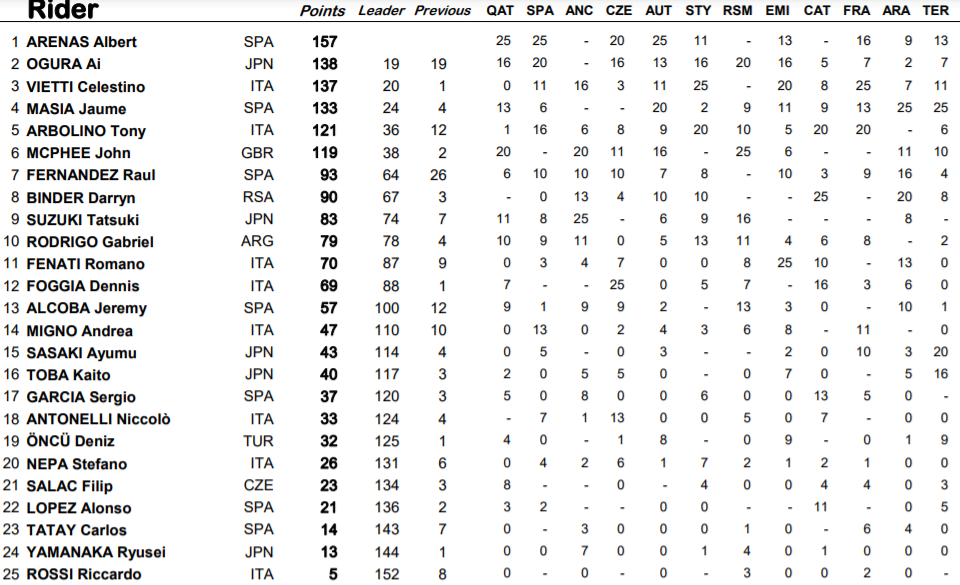 Au classement général de la Moto3 2020, Vietti est désormais troisième, à 20 points du leader du classement Albert Arenas, qui pilote pour l’équipe Aspar. Vietti n’est qu’à un point d’Ai Ogura (Team Asia), Cependant, le pilote Leopard Jaume Masia, qui a remporté les deux courses d’Aragon, est revenu à quatre points…
