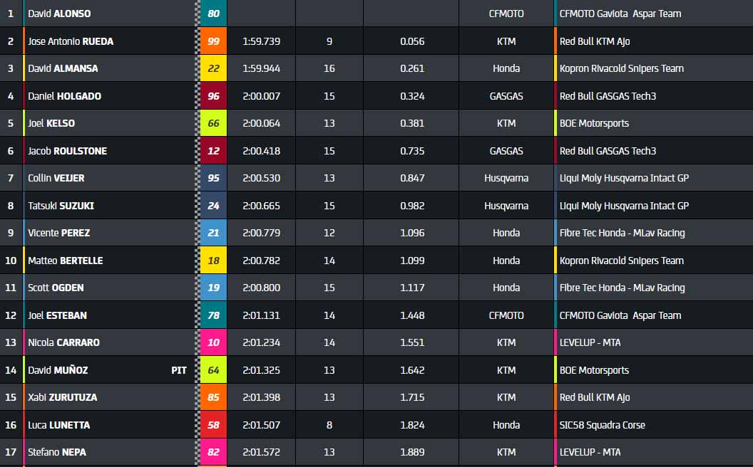 Joel Kelso (KTM Boé Motorsports), moins présent depuis quelques temps maintenant, montre une vitesse intéressante. José Antonio Rueda est assez largement devant la concurrence. Longtemps, il est le seul à être sous les 2 minutes au tour. Le rookie Luca Lunetta (Honda Sic58 Squadra Corse) ne manque pas de s’illustrer également.
