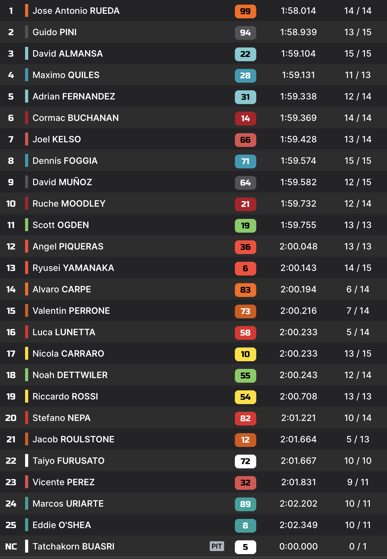 Alors que l’on entre dans les dix dernières minutes de FP, personne n’est en mesure de détrôner David Munoz. Le premier à faire trembler la marque de l’Espagnol, n’est autre que son voisin de garage. Six minutes avant de voir le drapeau à damier, Guido Pini signe un chrono en 1:59.497, qui le met devant. Quelques instants plus tard, il est déjà détrôné par Maximo Quiles. Le jeune protégé du Team Aspar bouclant un tour du circuit d’Aragon en 1:59.242.