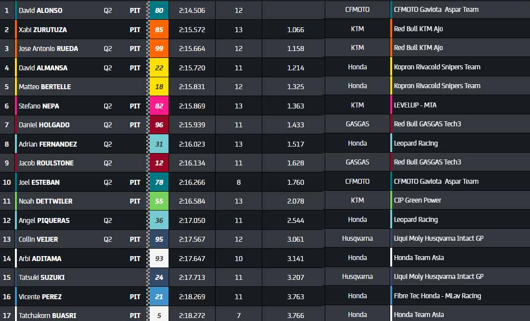 Attention au rookie Joel Esteban (CFMoto Aspar Team), qui prend brièvement les commandes ! L’Espagnol est plutôt discret depuis le début de saison mais est parvenu à se démarquer. Il est rapidement dépassé par son coéquipier David Alonso, alors que les meilleurs tournent à 15 secondes des chronos d’hier.