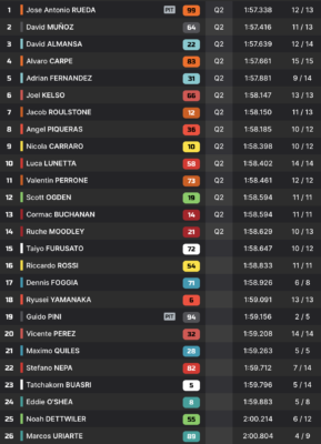 David Munoz et David Almansa complètent le top-3, et se rapprochent du leader par rapport aux chronos de la matinée. Maximo Quiles, victime des drapeaux jaunes, ne parvient pas à se qualifier dans le top-14, et devra passer par la Q1 ce samedi après-midi.