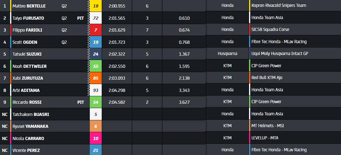 Finalement, Matteo Bertelle est le premier qualifié, juste devant Taiyo Furusato, Filippo Farioli et Scott Ogden (Honda MLav Racing). Nous les retrouverons en Q2 dans quelques instants.