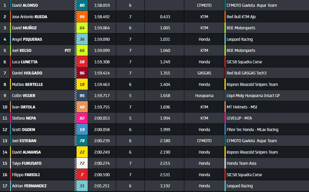 Finalement, à la présentation du drapeau à damier, David Alonso prend la pole position de manière implacable. José Antonio Rueda est deuxième, David Munoz (KTM Boé Motorsport) complète la première ligne. Angel Piqueras (Honda Leopard Racing) est quatrième, juste devant Joel Kelso.