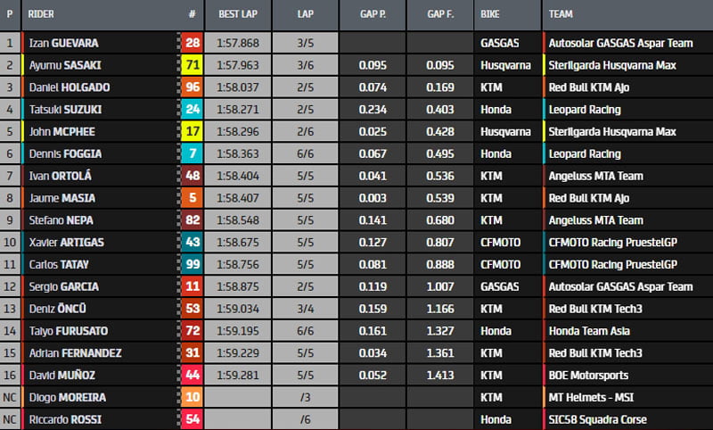 Quatrième temps pour Ayumu Sasaki (Husqvarna Max Racing Team) qui a précédé la CFMoto de Xavier Artigas et Dennis Foggia. Le pilote romain est suivi de Diogo Moreira (KTM MT Helmets – MSI), John McPhee (Husqvarna Max Racing Team), Jaume Masia (KTM Red Bull Ajo) et Sergio Garcia (GasGas Aspar), qui clôture le Top Ten.