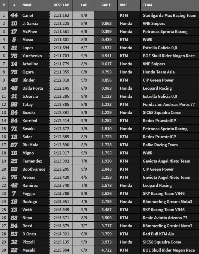 Dans ces conditions humides, c’est Suzuki qui réalise le temps de référence en 2.16.759s. Il est repris par López en 2.13.966s. Ogura, vient se positionner second en 2.14.879s. Mais c’est le pilote KTM, Binder qui vient faire la différence en s’emparant du meilleur chrono en 2.13.364s, très loin cependant des temps d’hier. Canet, le poleman d’hier, pointe au 6e rang.