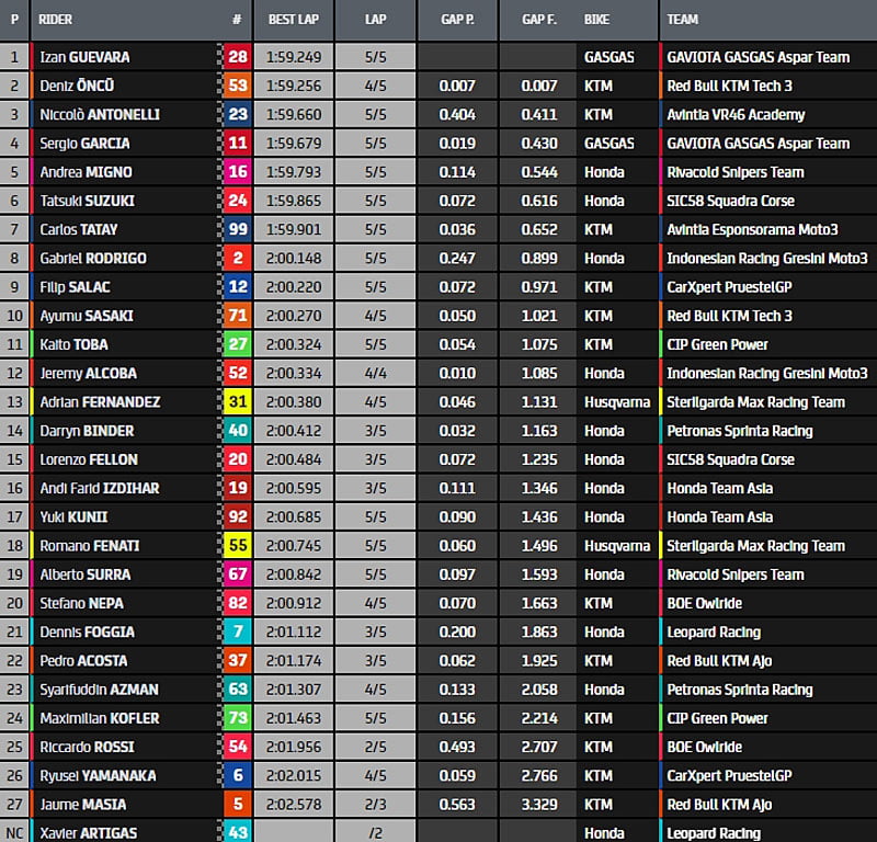 Sergio Garcia (GasGas) ouvrira la deuxième ligne avec le quatrième meilleur temps, où l’on retrouve également Andrea Migno (Honda Snipers) et Deniz Öncü (KTM Tech 3). Septième temps et troisième ligne pour Jeremy Alcoba (Honda Gresini), Niccolò Antonelli (KTM Avintia) et pour le leader du classement mondial Pedro Acosta (KTM Red Bull Ajo).