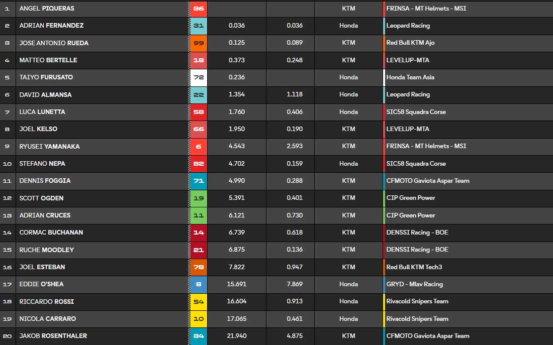 Matteo Bertelle, le poleman, et Taiyo Furusato complètent le top 5. Le Japonais est relégué de la quatrième à la cinquième place après avoir dépassé les limites de piste dans le dernier tour. Le grand perdant n’est autre qu’Alvaro Carpe, qui a chuté à quelques minutes de la fin.