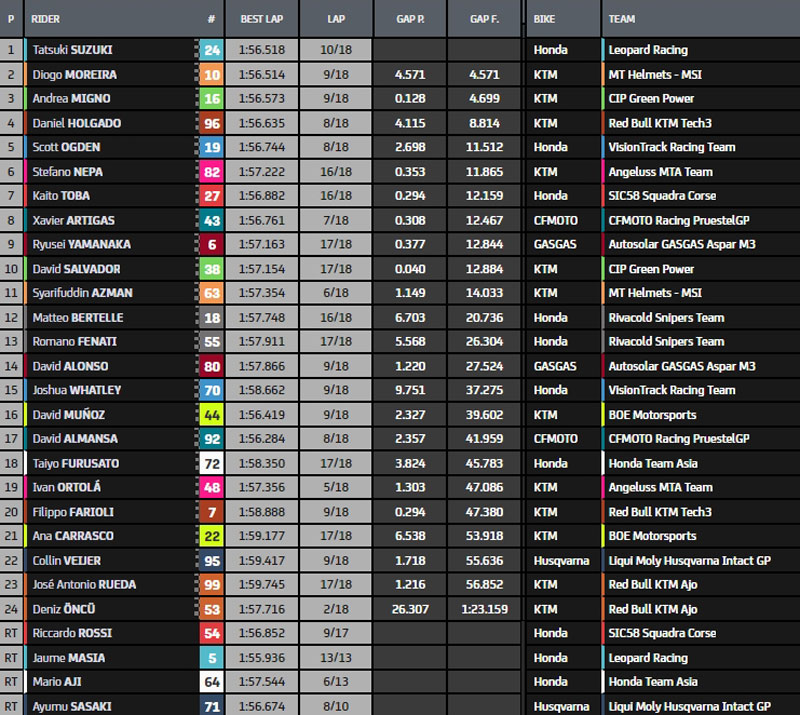 Finalement, Tatsuki Suzuki s’impose avec plus de sept secondes d’avance, majestueuse performance de sa part. Diogo Moreira sort du chaos en 2e position, devant un Andrea Migno héroïque. Dans les derniers instants, Riccardo Rossi (Honda SIC58 Squadra Corse) chute à son tour. Daniel Holgado conserve la tête du championnat du monde grâce à sa 4e place, car après l’arrivée, Scott Ogden (Honda VisionTrack Racing) se voit attribuer une pénalité de six secondes pour pilotage irresponsable.