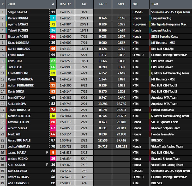 A l’issue d’un intense dernier tour, Sergio Garcia (GasGas, GasGas Aspar Team, #11) l’emporte sur le fil devant Dennis Foggia (Honda, Leopard Racing, #7) et Ayumu Sasaki (Husqvarna, Sterilgarda Husqvarna Max, #71). Tatsuki Suzuki (Honda, Leopard Racing, #24) termine au pied du podium, mais perdra une place sur tapis vert pour avoir dépassé les limites de la piste au cours du dernier tour.