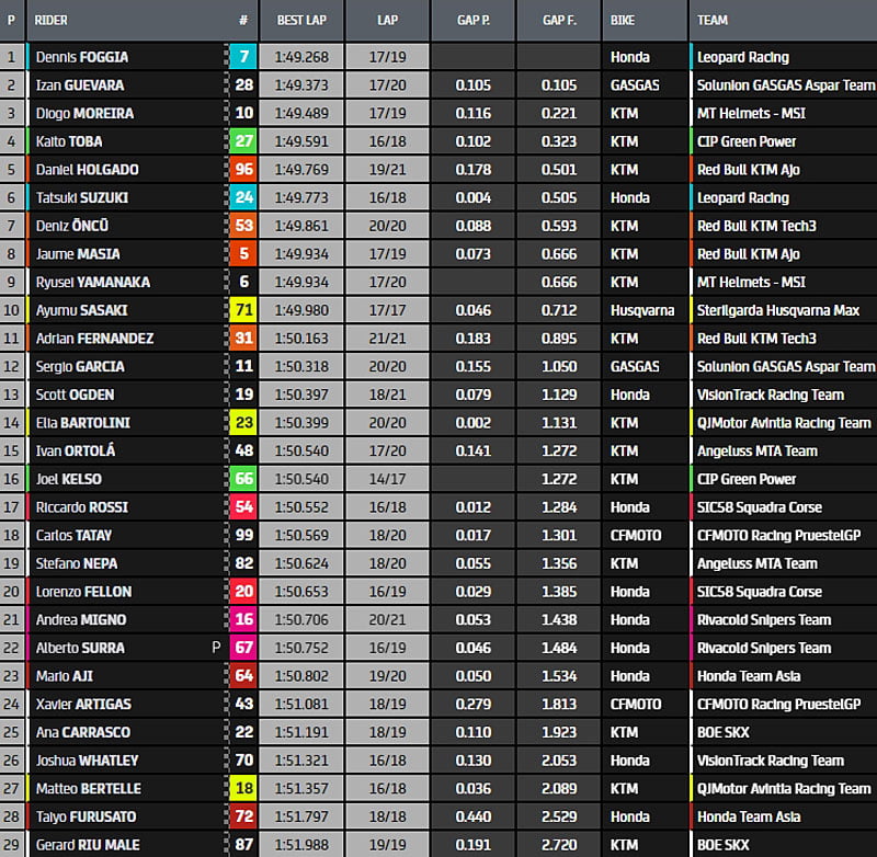 A l’issue de cette première séance d’essais de la journée, les pilotes ont déjà un très bon rythme. Dennis Foggia (Honda, Leopard Racing, #7) mène cette FP1 en 1’49.268, suivi par Izan Guevara (GasGas, GasGas Aspar Team, #28) et Diogo Moreira (KTM, MT Helmets – MSI, #10).