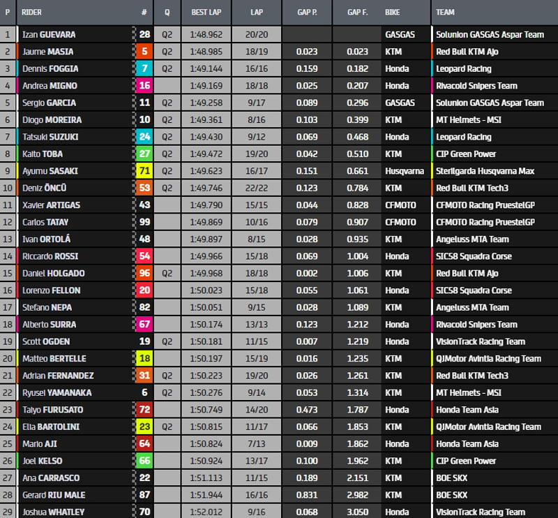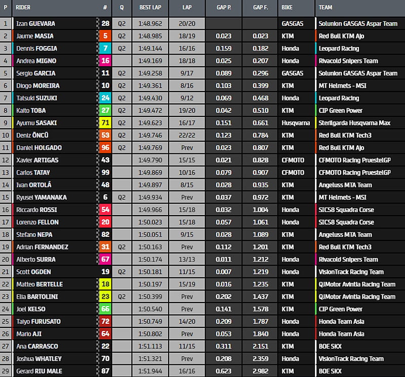 A mi séance, Sergio Garcia (GasGas, GasGas Aspar Team, #11) a repris les commandes, en 1’49.258, devant Izan Guevara (GasGas, GasGas Aspar Team, #28) et Tatsuki Suzuki (Honda, Leopard Racing, #24), dont le chrono réalisé au début de séance lui permet pour l’instant de sauver les meubles.