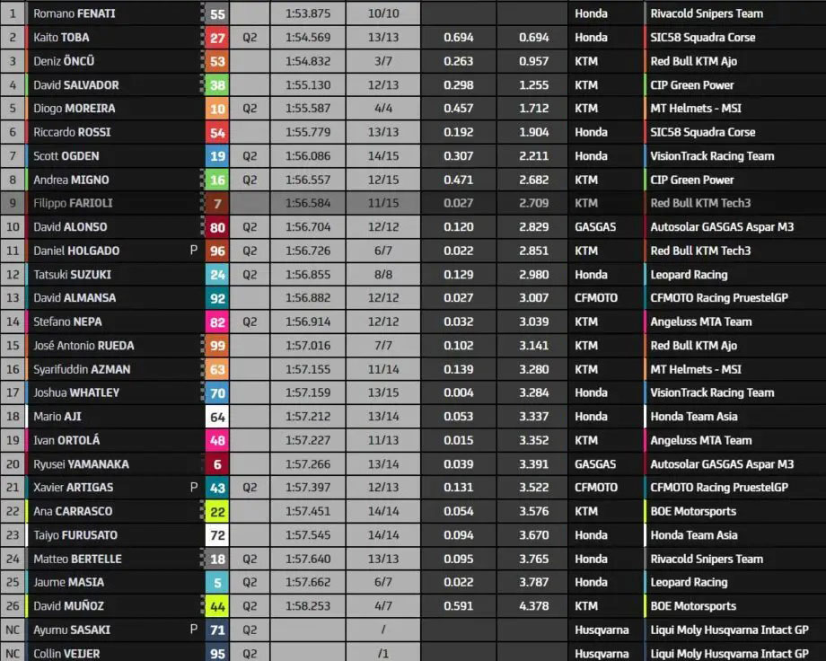 Romano Fenati revient à quelques longueurs, mais Deniz Öncü a encore une demi-seconde d’avance. Les deux hommes sont loin des autres, une information à noter en vue de la séance de qualification. Dans le dernier tour, tous améliorent …au profit de Romano Fenati ! Il est devant, mais sera en Q1 lui aussi. Il devance finalement Kaito Toba (Honda SIC58 Squadra Corse) et Deniz Öncü.