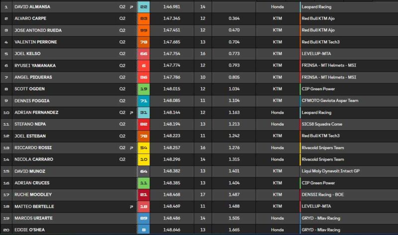 Taiyo Furusato (Honda Team Asia), qui était bien lancé, chute avec moins de trois minutes sur la pendule. Ce drapeau jaune pose bien des problèmes aux autres pilotes. Dans les derniers instants, personne n’arrive à détrôner David Almansa, le leader de la Practice avec un nouveau record de la piste. Il devance la paire Red Bull KTM Ajo Alvaro Carpe/José Antonio Rueda. Quatrième, le jeune Valentin Perrone, argentin très véloce.