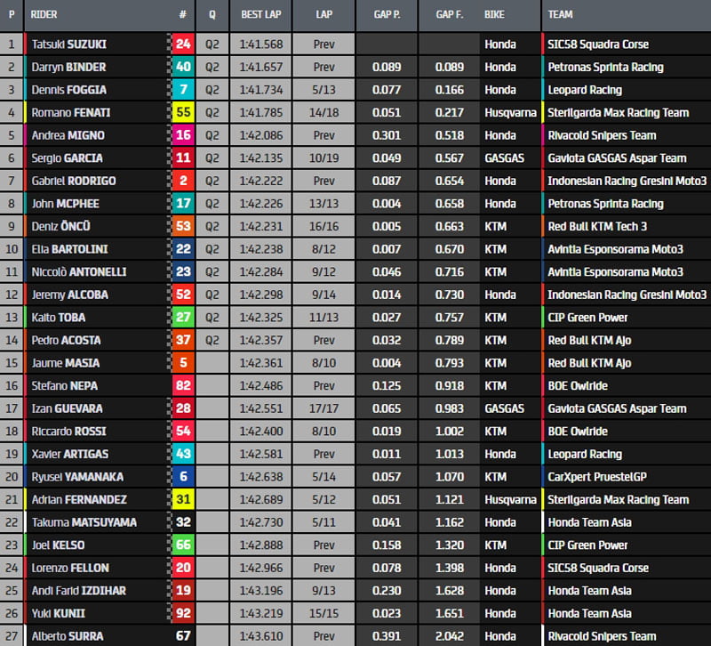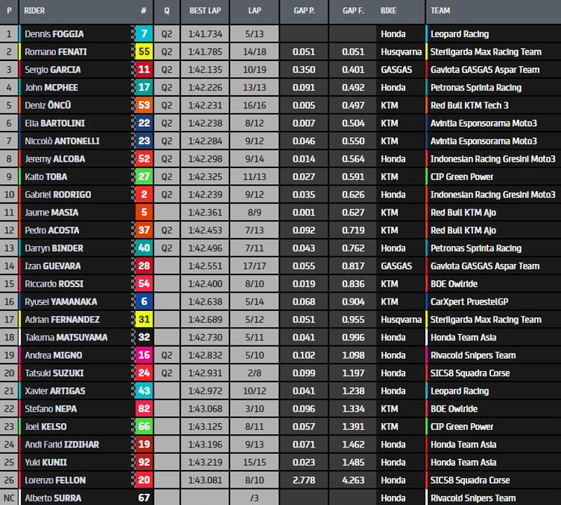 En raison de la pluie qui est annoncée ce matin, si le classement ne venait pas à évoluer, Stefano Nepa (KTM, BOE Owlride, #82), Sergio Garcia (GasGas, Aspar Team Moto3, #11), Kaito Toba (KTM, CIP-Green Power, #27) et Xavier Artigas (Honda, Leopard Racing, #43) seraient les heureux élus pour prendre part directement à la Q2.