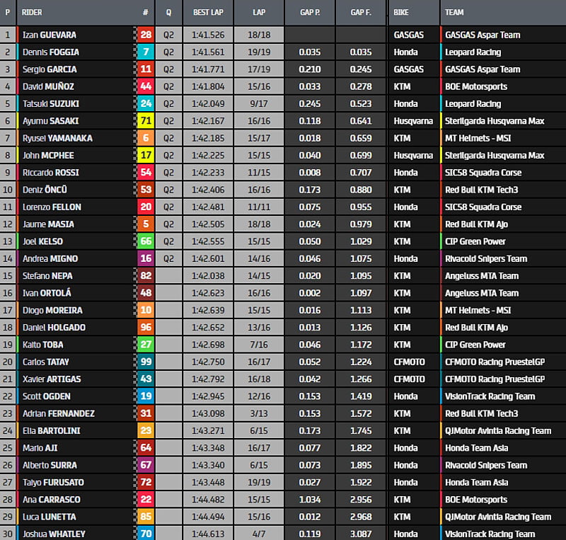 A l’issue de cette FP3 mouvementée, Dennis Foggia (Honda, Leopard Racing, #7) a repris la tête, mais au dernier moment, c’est Izan Guevara (GasGas, GasGas Aspar Team, #28) qui signe un 1’41.526. Le pilote Italien temrine deuxième, entouré des 2 GasGas, Sergio Garcia (GasGas, GasGas Aspar Team, #11) étant 3e. David Muñoz (KTM, BOE SKX, #44) prouve qu’il apprécie ce tracé, en terminant 4e. Malgré sa chute, le chrono de Lorenzo Fellon (Honda, SIC58 Squadra Corse, #20) lui permet d’être 11e et de se hisser en Q2.